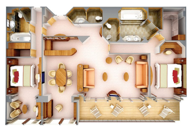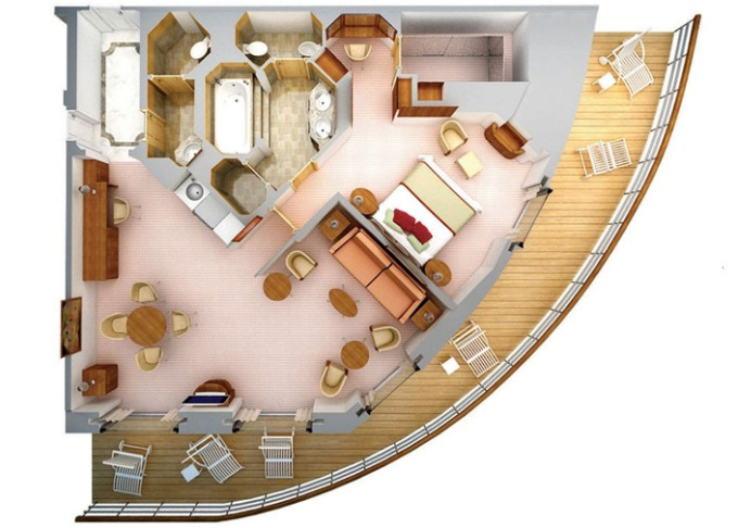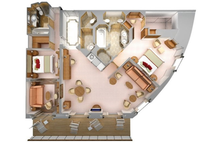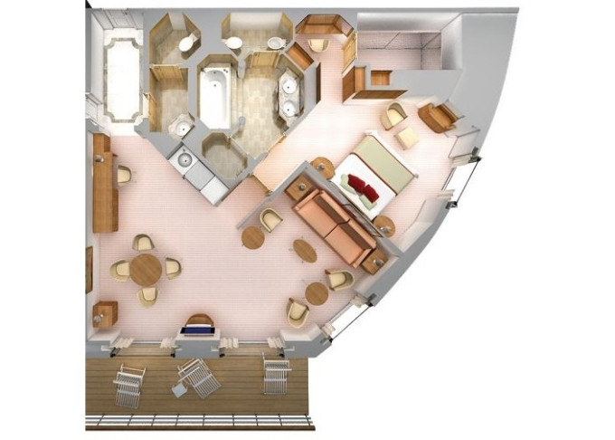 | R2 - Royal Suite 2 127 m² (vrátane 18 m² balkónov). Royal Suite prepojená s Veranda Suite. 7. paluba vpredu. Max 5 osôb. | 68 600 € 68 600 € za osobu |