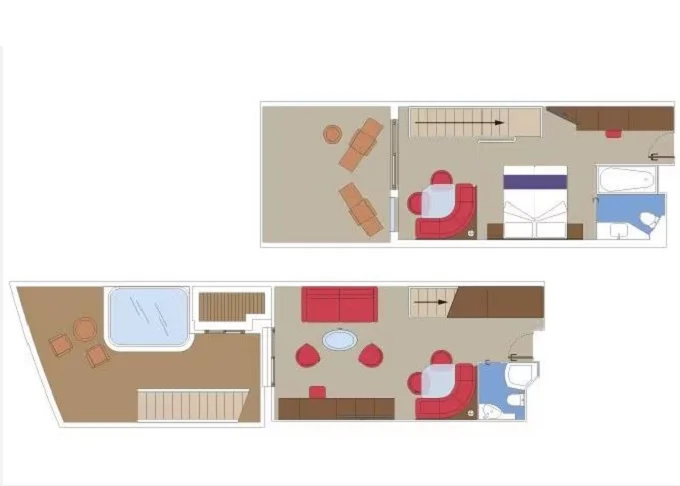 | YJD - Yacht Club Duplex Suite s vírivkou 46 m² + balkón 30 m². Vírivka. 2 podlažia, šatník, 2 kúpeľne (1 s vaňou). Max 4 osoby. 16. paluba. Cenový model MSC Yacht Club. | 7 550 € 7 550 € za osobu | ||