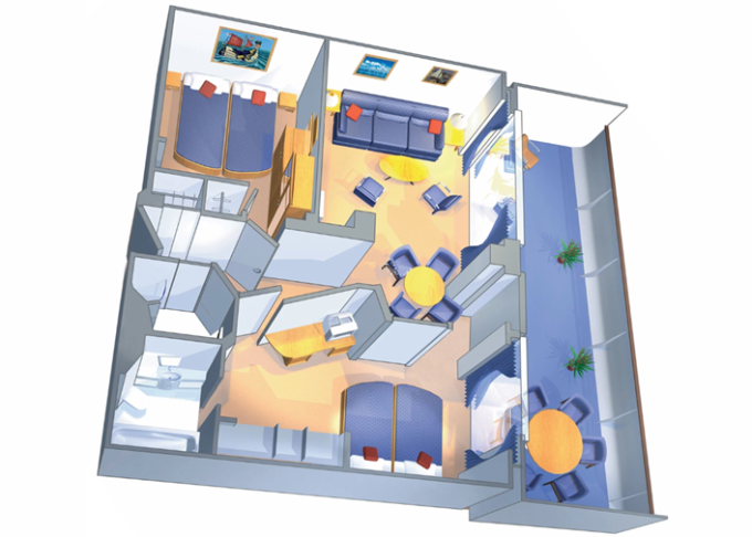 VP - Ocean View Panoramic Suite (bez balkónu) 38 m². Panoramatické neotvárateľné okná. 12. paluba. Max 6 osôb. Výhody Suite. 5 476 € 2 738 € za osobu